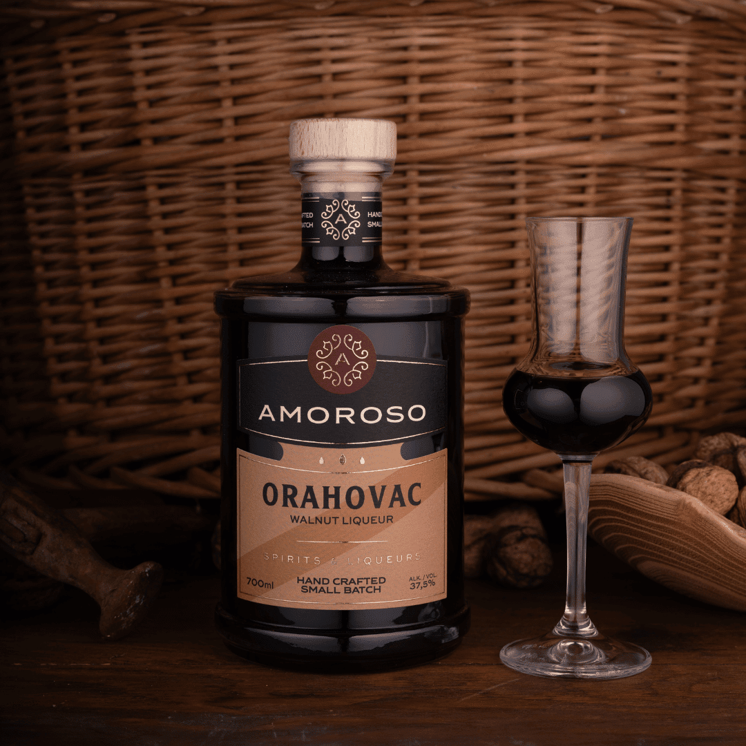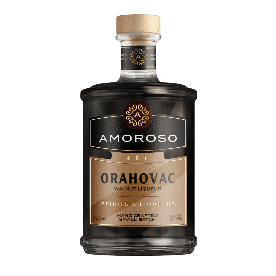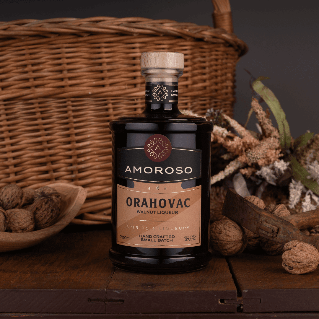 Orahovac pravimo od svježih, zelenih oraha koji su ručno birani početkom lipnja. Posjeduje toplu i duboku smeđu boju. Okus je bogat, pun i uravnotežen, s izraženim notama zrelog oraha kojeg je stekao upravo odležavanjem.